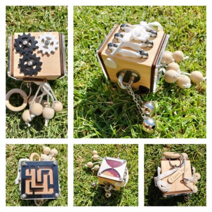 These wooden cubes are designed with a variety of real-life daily mechanisms, such as fidget toys, gears, and latches, that