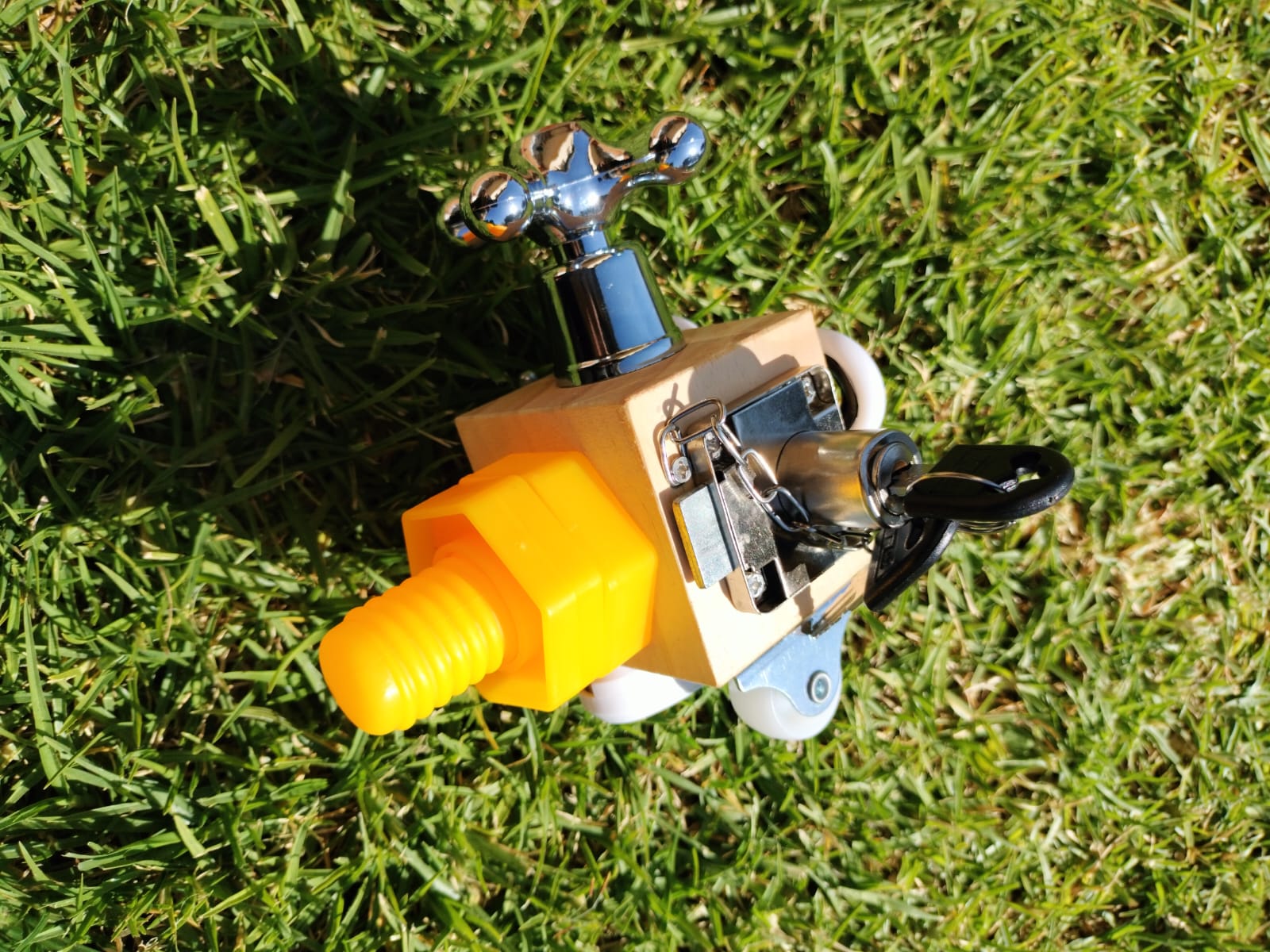 These wooden cubes are designed with a variety of real-life daily mechanisms, such as fidget toys, gears, and latches, that encourage hands-on exploration and problem-solving.